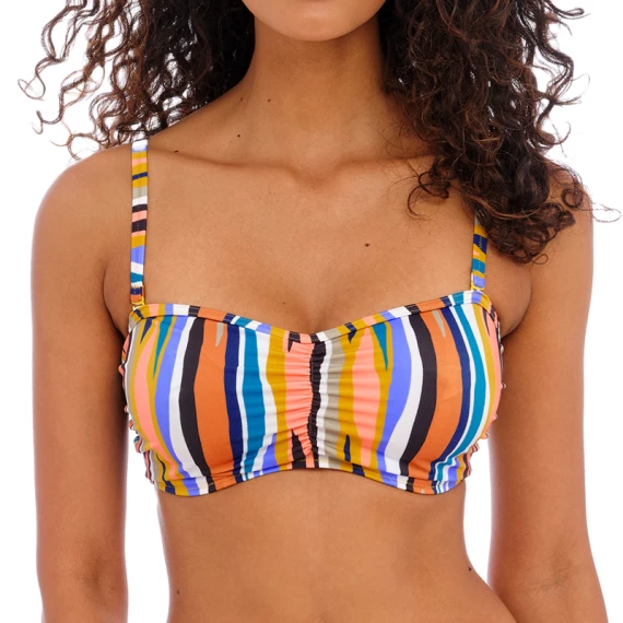 Das Torra Bay Bandeau Bikinitop von Freya Bademode ist in der Farbe Multi gehalten. Der Print auf diesem Oberteil ist eine Mischung aus Tierprint und einem abstrakten Streifenmuster. Das Oberteil ist in der Mitte in Falten gelegt, um das Dekolletee zu akzentuieren. Die Träger dieses Tops sind abnehmbar und können auf verschiedene Weise getragen werden. Kombinieren Sie dieses Bikinitop mit einem der Torra Bay Bikini Hosen.